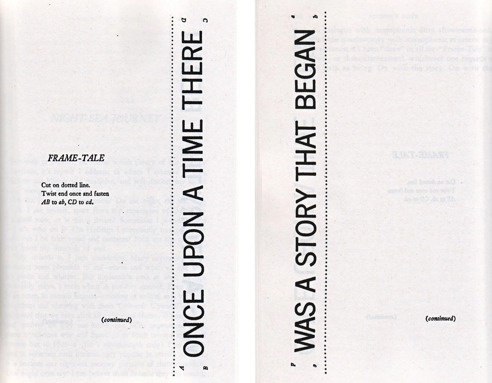 Barth’s seminal work Lost in the Funhouse lives up to its title in that reading it truly does feel wandering through a hall of mirrors. The opening “story” isn’t so much a “story” as it is a gimmick, consisting of two pages, each with a single phrase printed vertically along its border. The phrase “ONCE UPON A TIME THERE” is mirrored on the opposite page by “WAS A STORY THAT BEGAN”; the reader is instructed to cut, twist, and tape the two strips into a Möbius strip, thus forming an endless, looping line of text.
